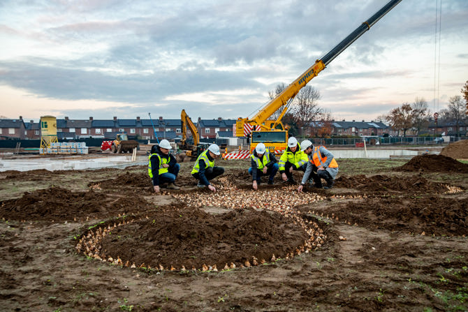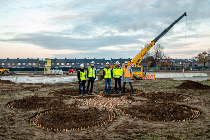 In de bloemenbuurt in Echt wordt volop gebouwd aan een nieuwe leefomgeving met veel groen: Bloemenhof. Om dit te vieren plantten JPO, Nester, gemeente Echt-Susteren, Jongen en Mansvelt Infra-ontwikkeling bloembollen. Een kroon op de samenwerking om dit braakliggende terrein in het smalste stukje van Limburg nieuw leven in te blazen. Deze samenwerking is ook een antwoord op de gewenste versnelling van de woningmarkt. Door naar elkaar te luisteren en de mens centraal te stellen, krijg je meer voor elkaar. Bloemenhof omvat diverse woningtypes: koopwoningen, sociale huurwoningen en middenhuurwoningen.