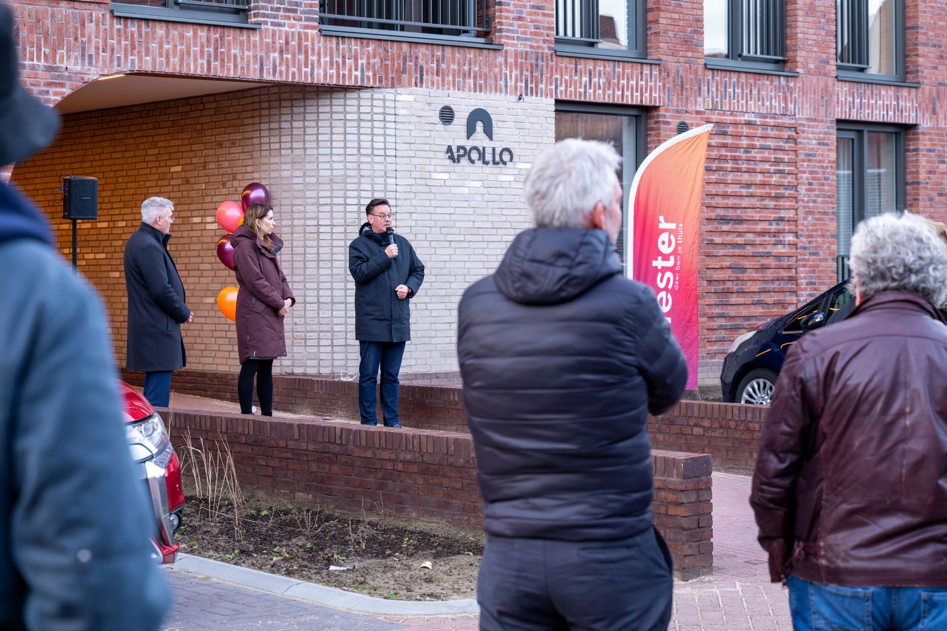Met de onthulling van de naam op de gevel is appartementencomplex Apollo in hartje Echt officieel geopend. In oktober kregen bewoners van de 30 woningen hun sleutel. Maandag 19 januari vierden we dit samen met erwtensoep en poffertjes.