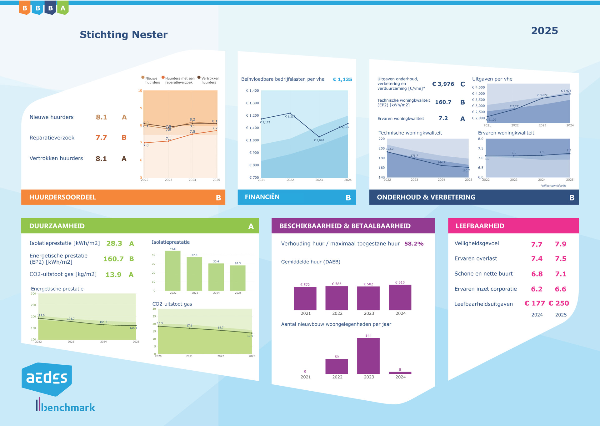 Elk jaar voert Aedes een onderzoek uit onder bijna alle corporaties in Nederland. Zo kunnen we vergelijken hoe we presteren ten opzichte van andere corporaties. De resultaten van 2025 zijn bekend. Voor het tweede jaar op rij doen we het beter dan het jaar daarvoor.
